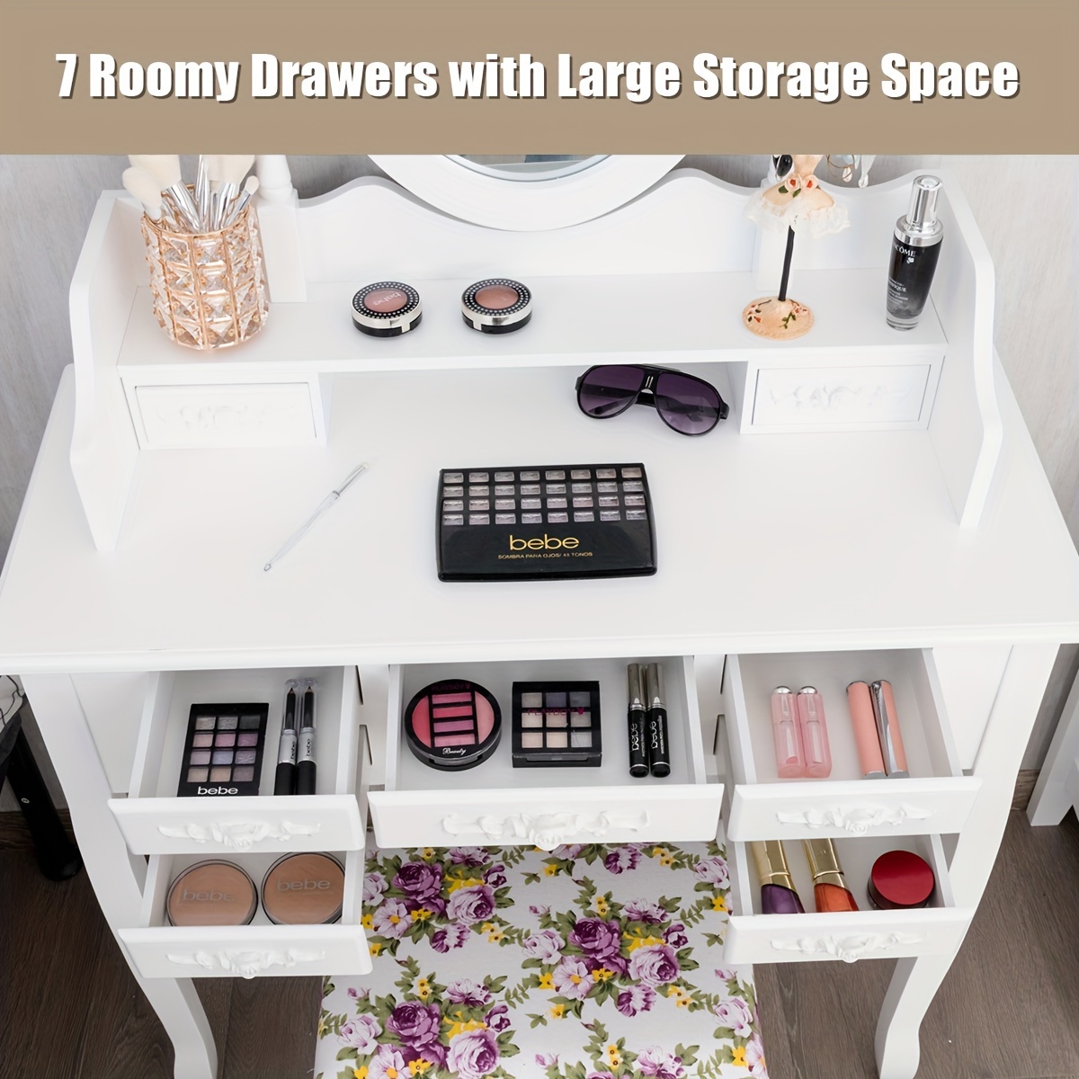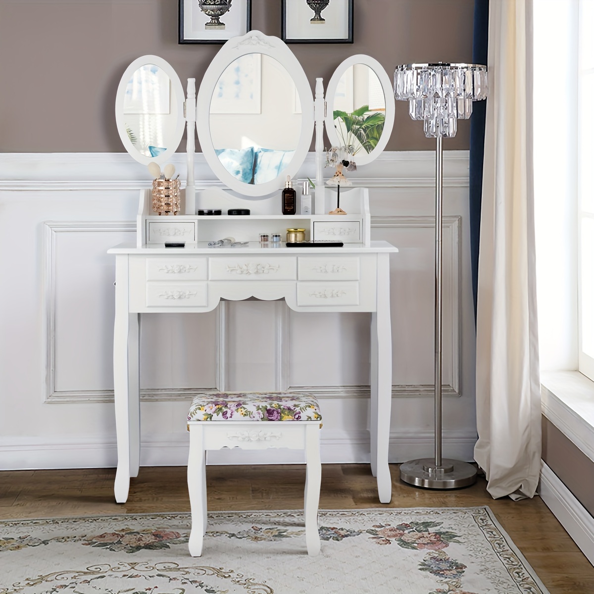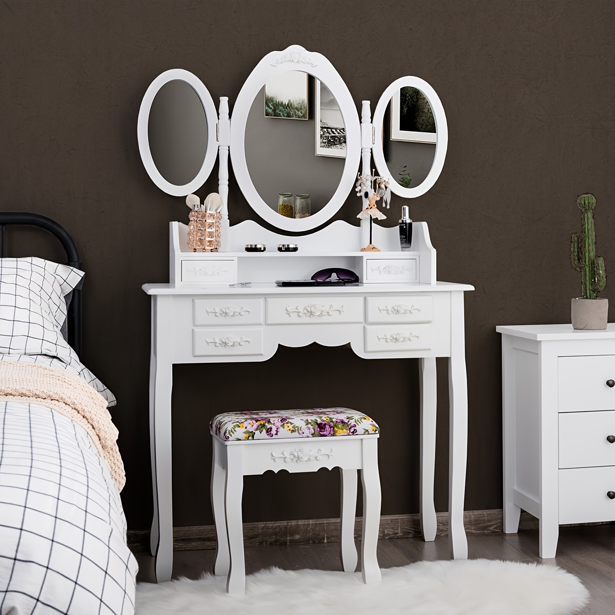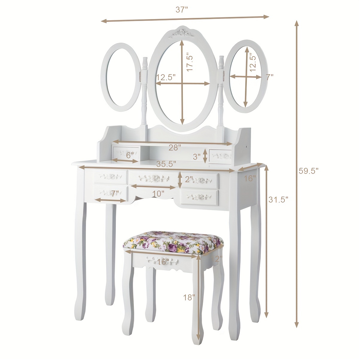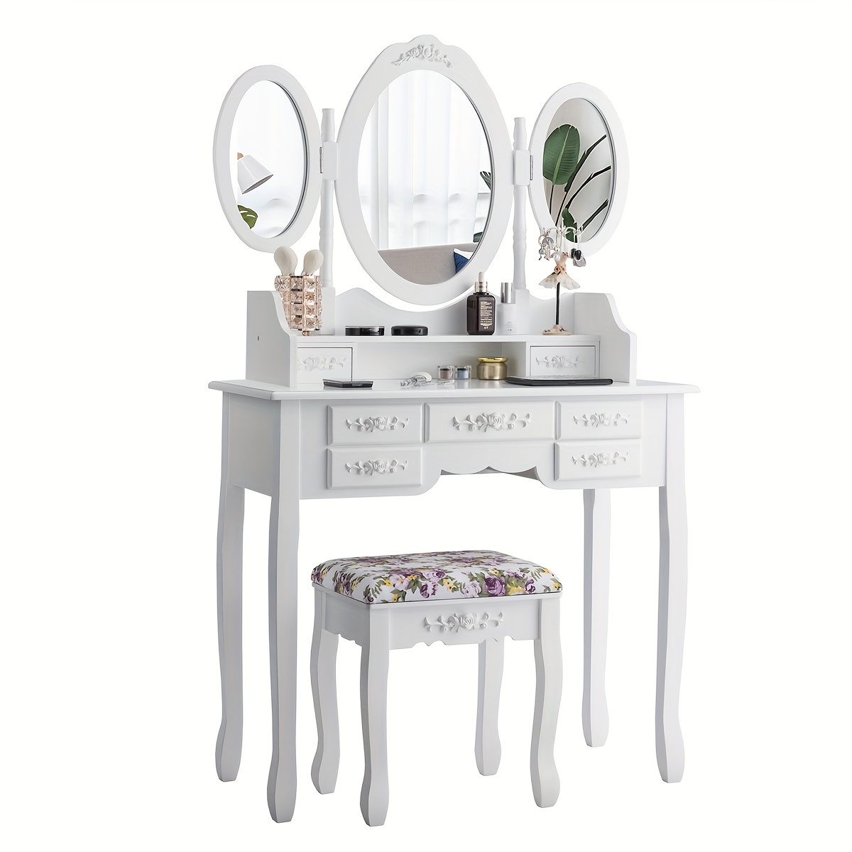 Vanity Makeup Set W/7 Drawer Tri-Folding Mirror Dressing Table & Stool Set White