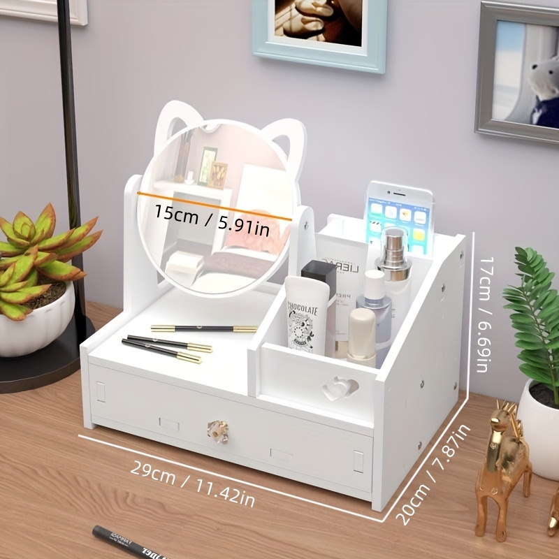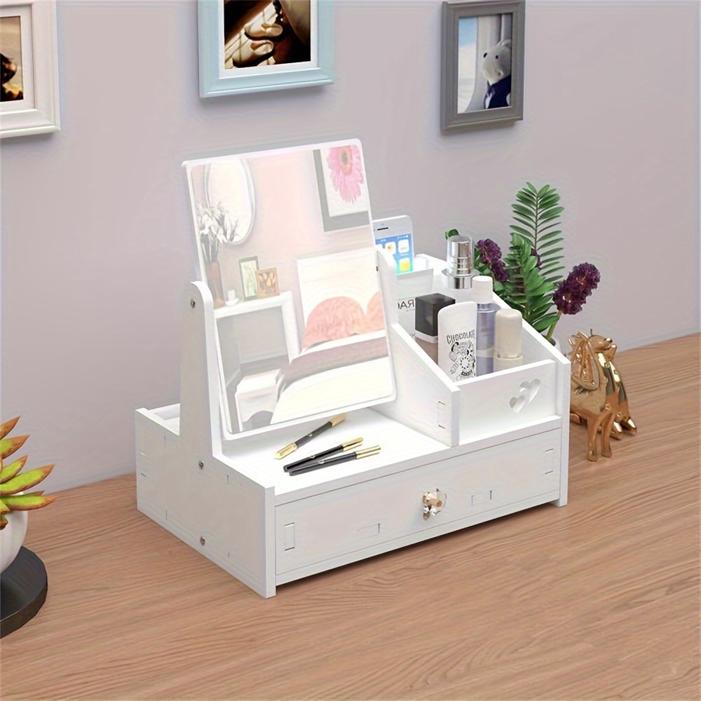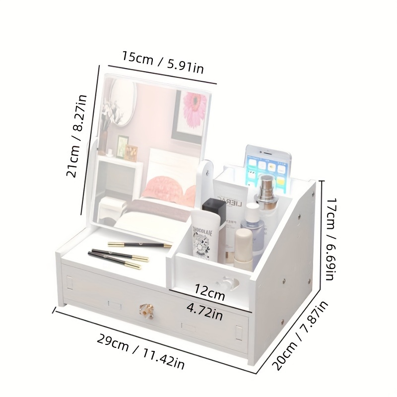 SPECIFICATIONSItem ID: QR118995Material: WoodenProduct Attributes: UnscentedWooden Desktop Makeup Organizer with Dustproof Drawer and Vanity Mirror - Cosmet$37.99Pricecolor*SelectQuantity*Add to Cart